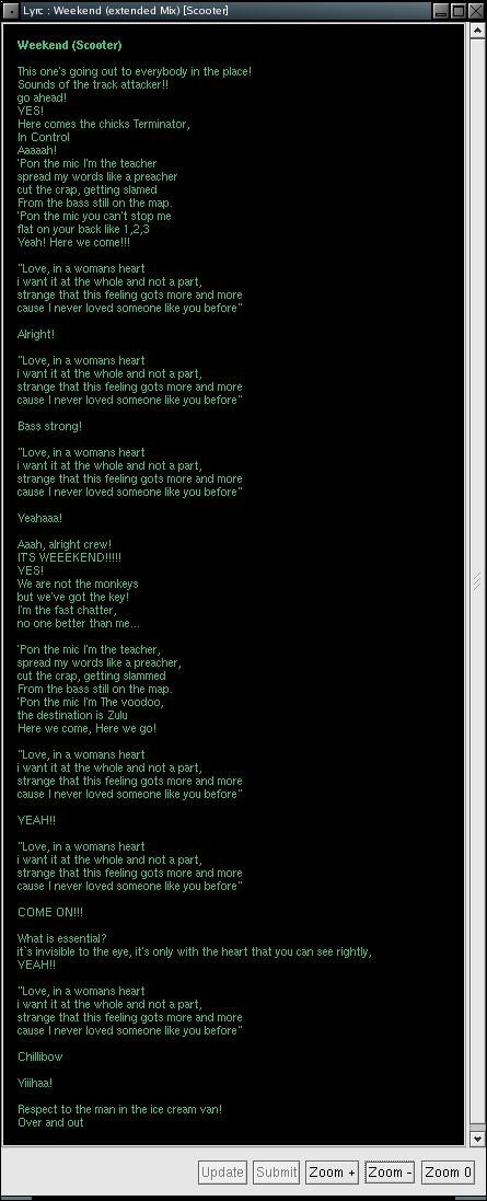 root@nostromo:/usr/src/redhat/RPMS/i386# rpm -qpi lyrc-0.2-1.i386.rpm Name : lyrc Relocations: (not relocateable) Version : 0.2 Vendor: Weyland Yutani Release : 1 Build Date: Sat Jan 10 00:20:47 2004 Install date: (not installed) Build Host: nostromo.pLANetOne.at Group : Applications/Console Source RPM: lyrc-0.2-1.src.rpm Size : 88788 License: GPL Packager : Nostromo Eiljeen URL : http://www.lyrc.com.ar Summary : A lyrics displayer for xmms. Description : Lyrc is an XMMS plugin, which displays the lyrics of the song being played. It queries a Web server for the lyrics, and the Web site also accepts uploads, allowing users to contribute missing lyrics. Lyrics are cached in XML files on the local machine.